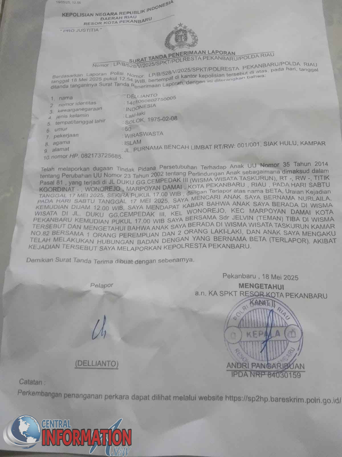 Dan laporan keluarga korban telah diterima pihak polresta Pekanbaru pada tanggal 18-05-2025,dugaan tindak pidana persetubuhan terhadap anak UU Nomor 35 Tahun 2014 tentang perubahan UU Nomor 23 Tahun 2002 tentang perlindungan anak sebagaima yang dimaksud dalam Pasal 81.