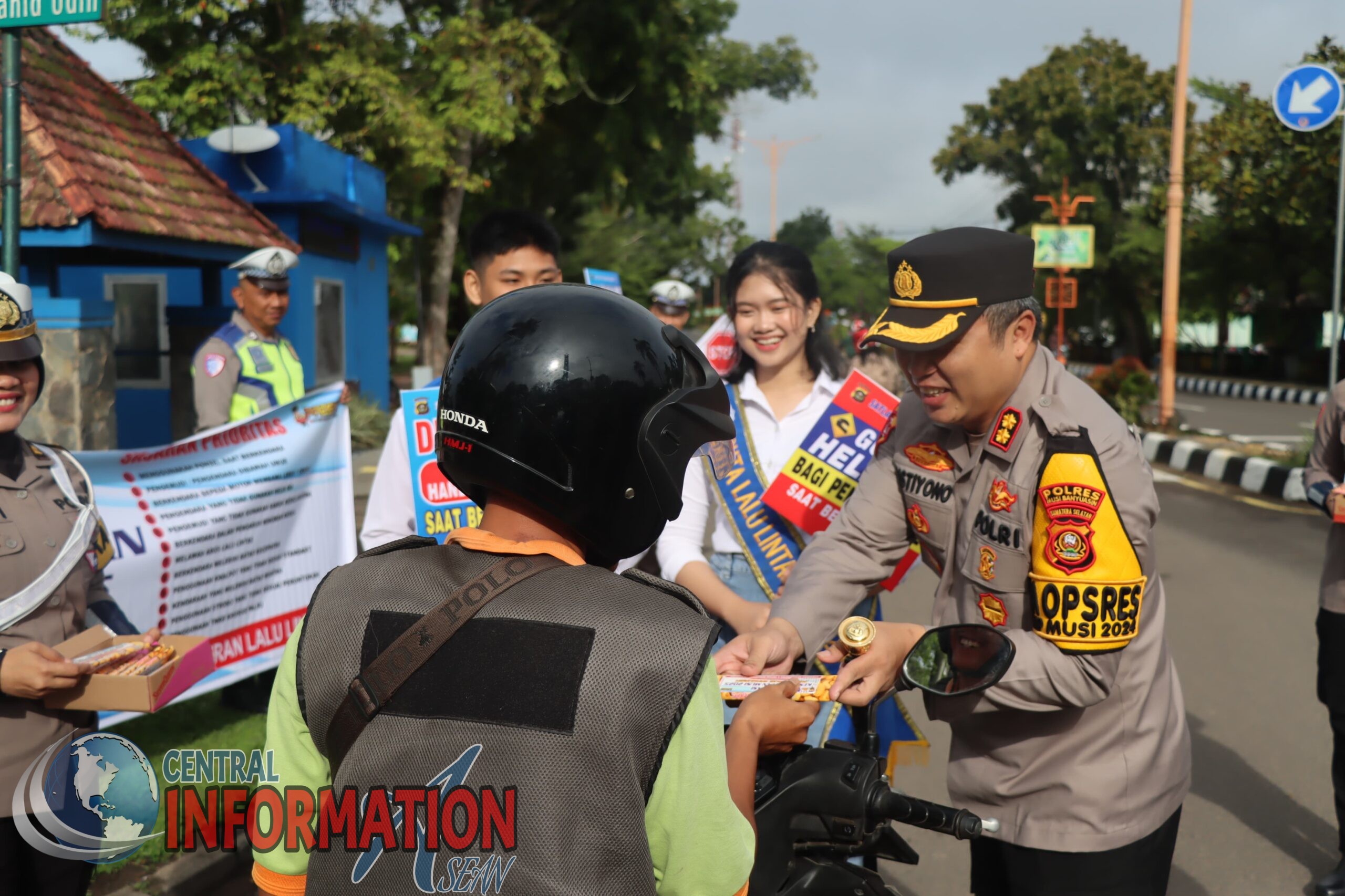 Polres Musi Banyuasin dipimpin langsung oleh Kapolres Musi Banyuasin AKBP Listiyono Dwi Nugroho, SIK, MH membagikan Cokelat “Kasih Sayang” kepada pengendara di jalan raya yang tertib berlalu lintas.