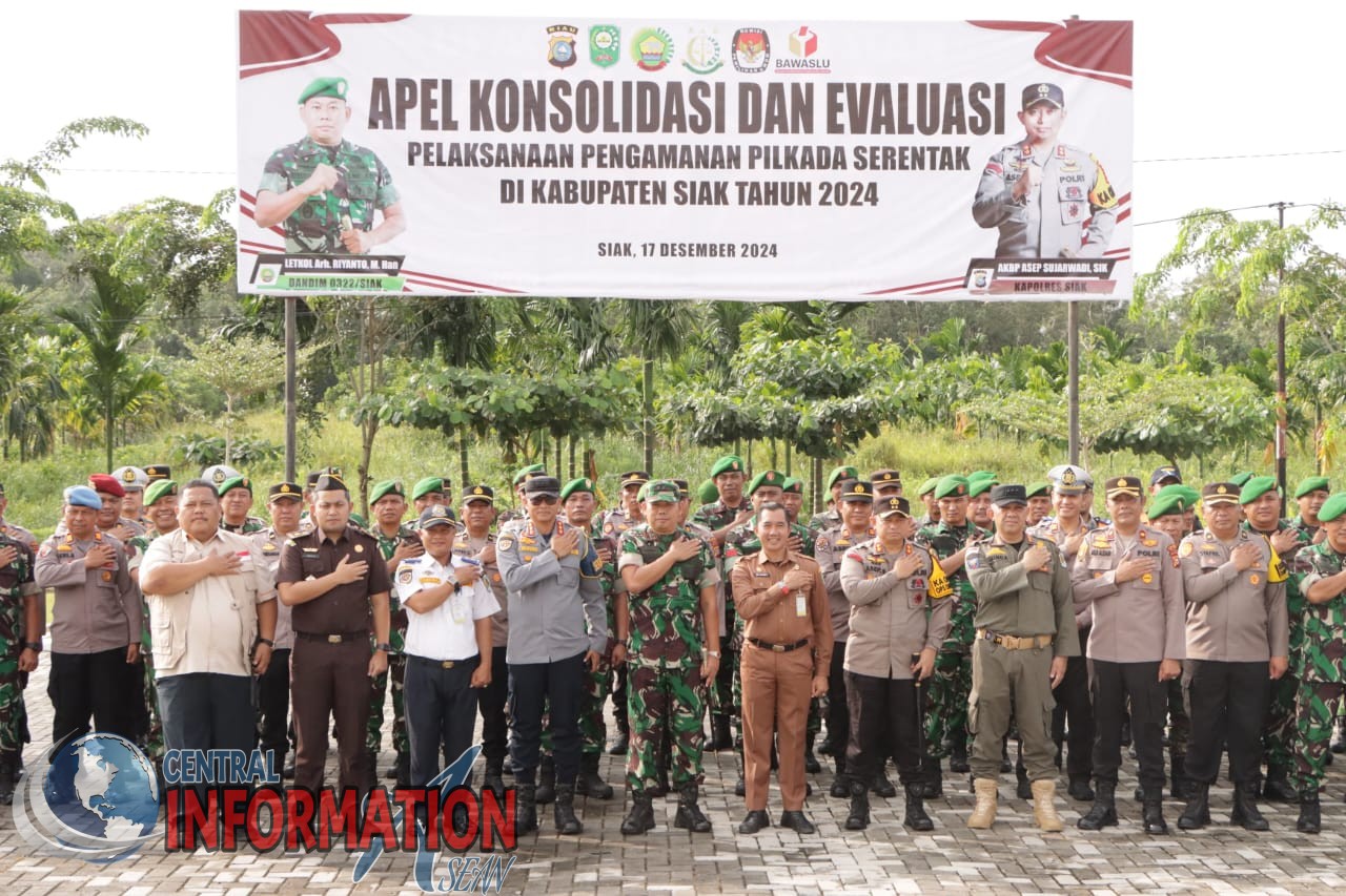 Siak,–Cnetralinformationasesn.com) Dalam rangka evaluasi dan konsolidasi pelaksanaan pengamanan Pemilihan Kepala Daerah (Pilkada) serentak 2024, Polres Siak dan Kodim 0322 / Siak menggelar apel yang dipimpin oleh Kapolres Siak, AKBP Asep Sujarwadi, SIK, MSI, dan Dandim 0322/Siak, Letkol.Arh Riyanto Budi Nugroho, M.Han. Selasa (17/12/2024).